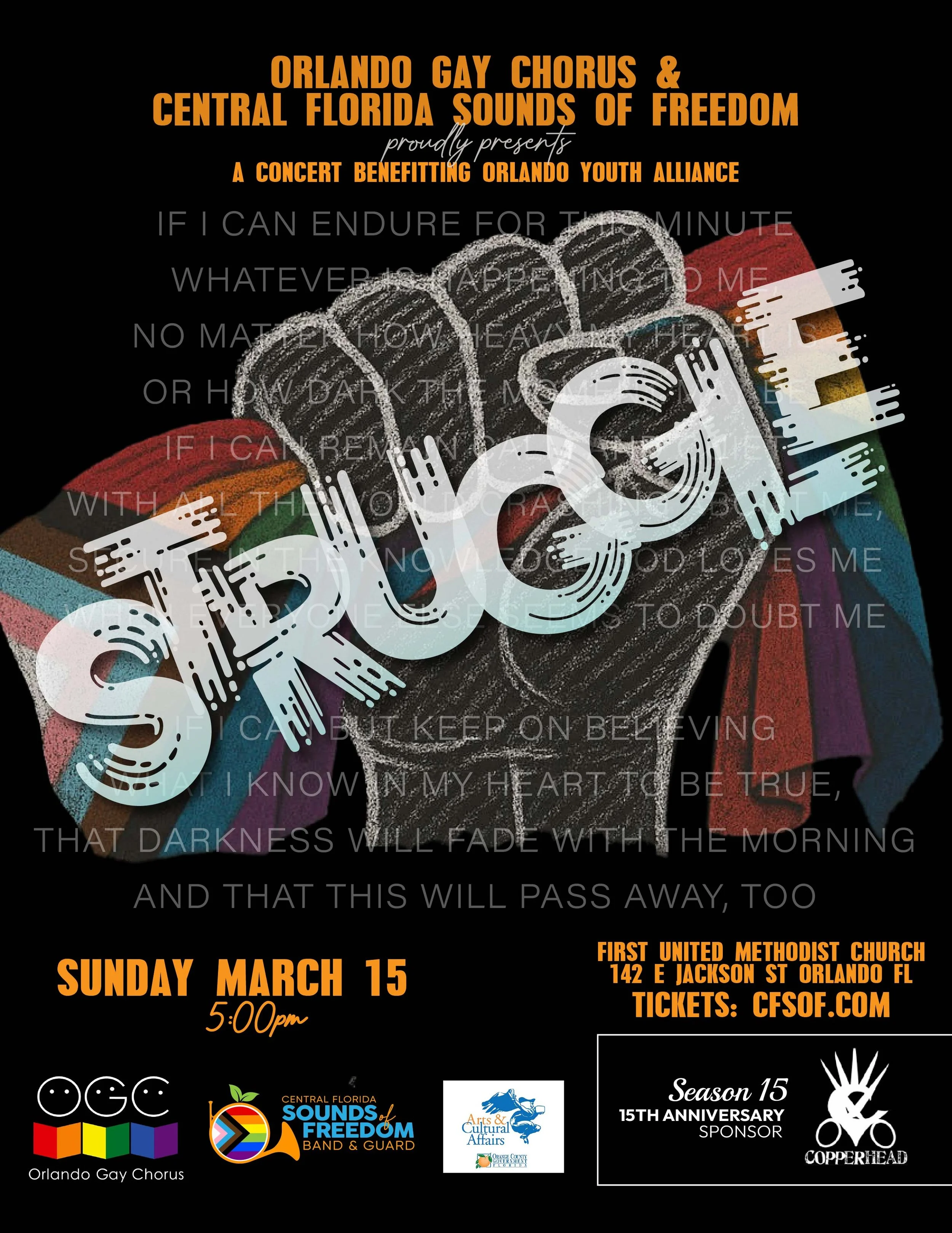 Orlando Gay Chorus is excited to collaborate with the Central Florida Sounds of Freedom Band and Color Guard. STRUGGLE is a powerful benefit concert uniting the Central Florida Sounds of Freedom Band & Guard and the Orlando Gay Chorus for one unforgettable evening of music, movement, and community. Join us Sunday, March 15 at 5:00 PM at First United Methodist Church in downtown Orlando as we come together in support of Orlando Youth Alliance, raising vital funds for programs serving LGBTQ+ youth in Central Florida. Admission is open with donations encouraged, and 100% of proceeds benefit OYA. Experience stirring performances, vibrant visuals, and a shared message of resilience, hope, and solidarity.