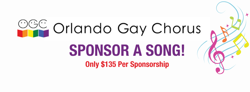 As we begin our 36th season, we are offering song sponsorships for Fierce & Fabulous: Celebrating LGBTQ+ Artists for a donation of $135. Your name and a brief message will appear next to the song title in the program. Your generous donation will help the chorus continue its mission to create a community that affirms diversity through the performing arts. Song sponsorships are on a first come, first served basis. Songs are subject to availability. To make your song selection, please contact Sean Mundyschein at smundyschein@orlandogaychorus.org. We hope you will join us on Friday, May 15th at the Ritz Theater in Sanford and/or on Sunday, May 31st at Steinmetz Hall at the Dr. Phillips Center.